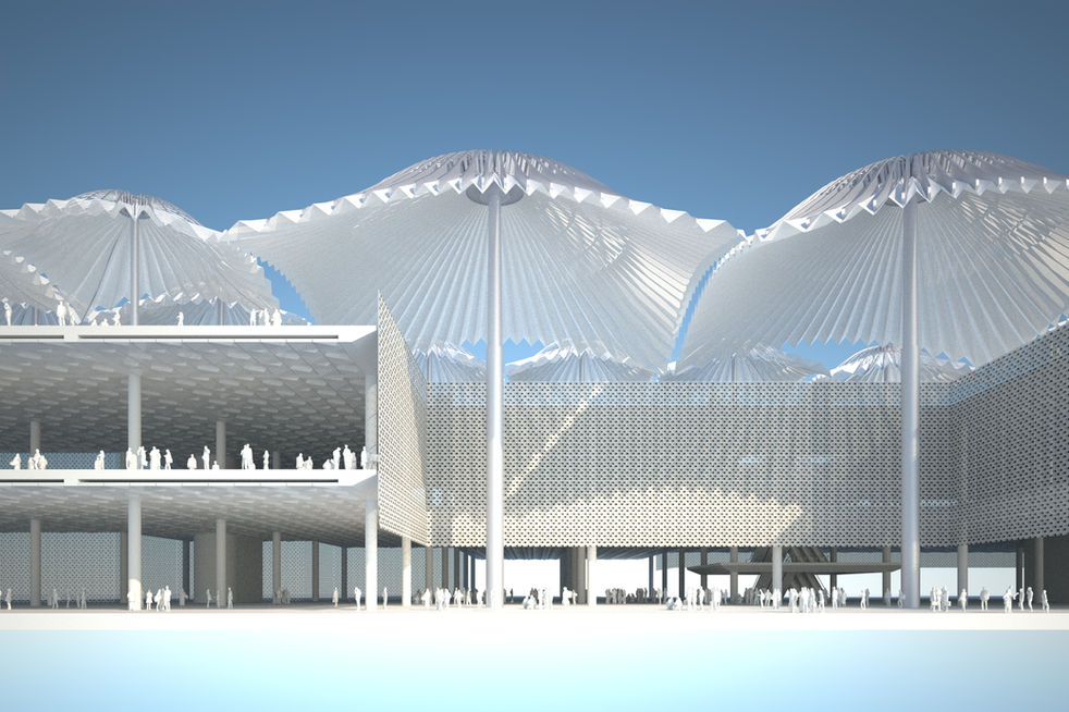 Their proposal features a cluster of canopies providing shade for people, plazas, and buildings, while reducing the heat island effect. Retractable canopies allow for natural cooling and prayer under the stars, protecting pilgrims from the hot sun during the day. The existing building will be retained, with a new outer edge defined by a 660-meter radius circle around the Ka’aba. This design ensures the existing mosque remains operational during construction, keeping all entrances accessible and avoiding additional pressure on the current structure. Some canopies could incorporate thin-film PV panels to generate electricity. These canopies, as small, singular elements, also obscure the view of distant high-rise buildings, facilitating spiritual contemplation without visual disturbances.